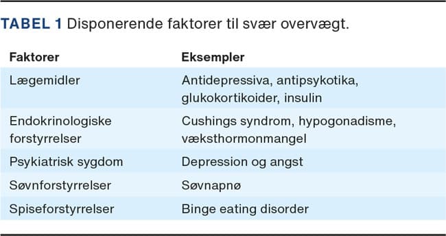 Før en vægttabsbehandling må man overveje, om der er eventuelle underliggende årsager til overvægten. Selvom der hos langt de fleste patienter ikke vil kunne findes en enkeltstående forklaring, er det alligevel vigtigt, da eventuelle reversible faktorer, som i hvert fald delvist kan bidrage til udviklingen af overvægt, vil kunne korrigeres. Således kan man vha. en grundig anamnese, objektiv undersøgelse og biokemisk screening identificere lægemidler, som disponerer til overvægt, endokrinologiske forstyrrelser, psykiatrisk sygdom eller søvnproblemer (Tabel 1) og kræver videre udredning. Binge eating disorder (BED) forekommer hyppigere hos patienter med svær overvægt (8%) end i baggrundsbefolkningen (4%) og er karakteriseret ved gentagne overspisninger, men i modsætningen til bulimi kompenseres disse ikke af efterfølgende provokeret opkastning [13]. Overspisningerne er præget af kontroltab og fortsætter i nogle tilfælde på trods af mæthed eller et fysisk ubehag og foregår ofte i smug. Behandlingen af BED er psykoterapeutisk, og i behandlingen søger man at undgå samtidigt vægttab [13]. Når spiseforstyrrelsen er stabiliseret, kan overvægtsbehandling være relevant. Hvis der forsøges overvægtsbehandling, uden at den underliggende spiseforstyrrelse adresseres, er risikoen for behandlingssvigt stor og kan bidrage til en kronificering af spiseforstyrrelsen [13]. Mistanke om BED bør lede til specialiseret udredning. Selvom dette ikke aktuelt udbydes rutinemæssigt i offentligt regi, pågår der i nogle regioner projekter, som tilbyder udredning og behandling, og der er en forventning om en større udbredelse af behandlingstilbud fremadrettet.