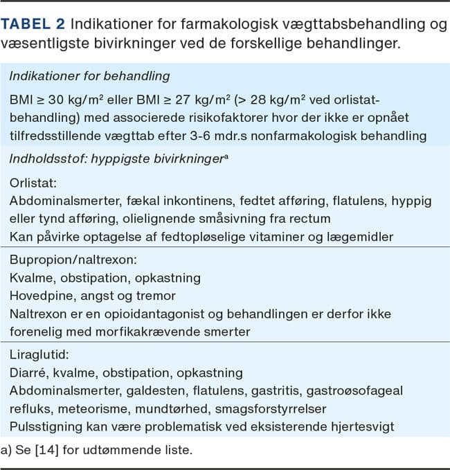 Valget af farmakologisk behandling er individuelt og vil primært være betinget af de ledsagende bivirkninger og patientens økonomiske formåen, da behandlingerne ikke er tilskudsberettigede. Indikationen for behandlingerne er anført i Tabel 2. Som udgangspunkt vil man vælge den bedst tålte behandling med størst effekt, og man vil kun fortsætte behandlingen, hvis den har vist sig effektiv (> 5% vægttab) i en tremåneders prøveperiode.