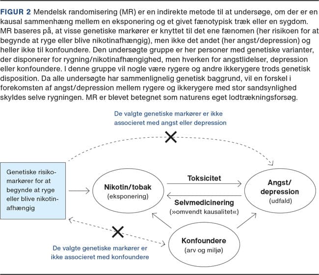 I systematiske review af studier af sammenhængen mellem rygning og depression og angst konkluderes det, at toksicitet af nikotin og tobak forklarer mere af associationen, end selvmedicinering gør [15, 16]. En af de stærkeste metoder til at sandsynliggøre kausalitet er mendelsk randomisering, hvor genetiske markører anvendes til undersøgelse af kausaliteten mellem eksponering og udfald (Figur 2). I et nyligt publiceret studie inkluderede man 378 genetiske markører og fandt, at tidligere eller nuværende rygning fordobler risikoen for depression, og at tidlig debutalder udgør en yderligere risiko. Omvendt øgede depression i mindre grad risikoen for tobaksrygning [17].
