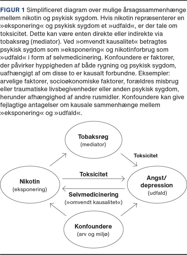 En udbredt opfattelse er, at tobaksrygning fungerer som middel til at selvmedicinere psykiatriske symptomer med nikotin. Det kan dog også tænkes, at tobaksrygning er neurotoksisk og medvirker til at udløse eller forværre psykisk sygdom. F.eks. er hyppigheden af angst og depression ca. dobbelt så høj blandt rygere som blandt ikkerygere [4, 5]. Hypoteserne om selvmedicinering og toksicitet udelukker ikke hinanden, ligesom associationen mellem rygning og psykisk sygdom kan skyldes diverse konfoundere (Figur 1).