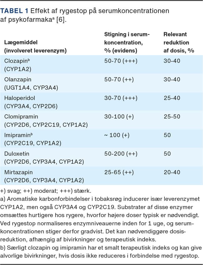 I Danmark indgår behandling af nikotinafhængighed ikke som en automatisk del af den psykiatriske behandling. Tilsvarende er psykiatrisk morbiditet og behandling oftest ikke tilstrækkeligt inddraget i kommunernes rygestopbehandling af denne gruppe. Koordinerede forløb er afgørende, dels fordi afhængighed af rusmidler både biologisk og symptomatisk har mange fællestræk med angst og depression, dels fordi tobaksrøg – og dermed rygestop – kan påvirke effekten af visse psykofarmaka (Tabel 1). For en systematisk gennemgang af dette henvises til [6].