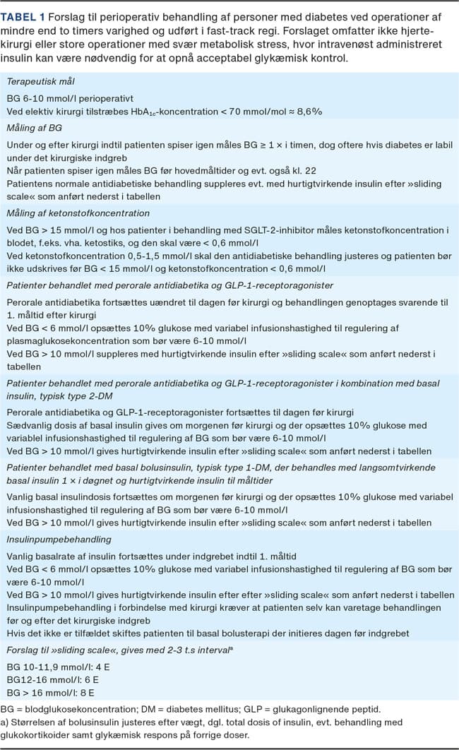 På operationsdagen kan opstartes et af flere regimer med infusion af glukose og subkutan eller i.v. insulin (tilsat kalium efter behov) samt evt. justering af patientens vanlige insulinbehandling. Kombinationerne er talrige og af varierende kompleksitet [1]. BG måles minimum en gang i timen, og dosering af insulin justeres derefter [1]. Regimerne er uspecifikke og tilrettelagt efter patientens vanlige behandling samt indgrebets varighed og størrelse og lokal tradition for perioperativ behandling. Der foreligger ikke evidens for, hvilket regime der bedst opfylder behandlingsmålet. Den danske behandlingsvejledning bygger på guidelines fra National Health Service, UK (NHS) og American Diabetes Association, US (ADA). I Tabel 1 er foreslået et perioperativt behandlingsregime til operationer af < 2 timers varighed i et fast-track regi, dog undtagen andre indgreb med udtalt metabolisk stress, og hvor brug af i.v. insulininfusion ofte vil være optimal med henblik på at optimere den glykæmiske kontrol. Fordelen ved brug af basal insulin subkutant er, at patienten vil have et depot af insulin i kroppen, hvilket modvirker svær hyperglykæmi i modsætning til f.eks. et i.v. glukose-, insulin- og kaliumdrop, hvor patienten er uden insulin kort tid efter, at droppet er stoppet pga. den korte halveringstid for insulin på ca. 6 min.
