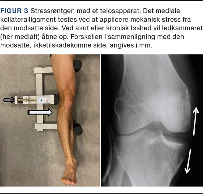 Ved kroniske tilstande kan suppleres med stressrøntgen (f.eks. telosmåling, Figur 3), hvor de enkelte ligamenters stabilitet undersøges i røntgengennemlysning. Det behandlingsmæssige resultat kan forringes, hvis knæakserne ikke er korrekte i alle planer, og de kan udmåles på røntgenoptagelser med patienten i stående stilling.