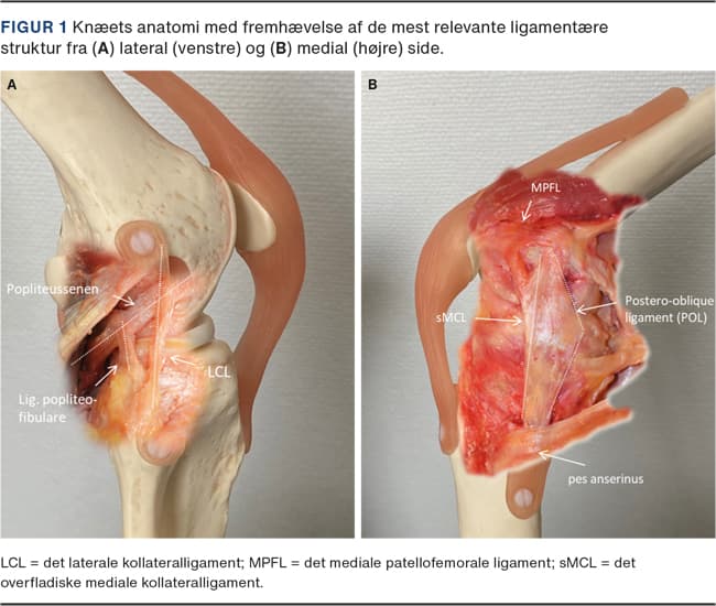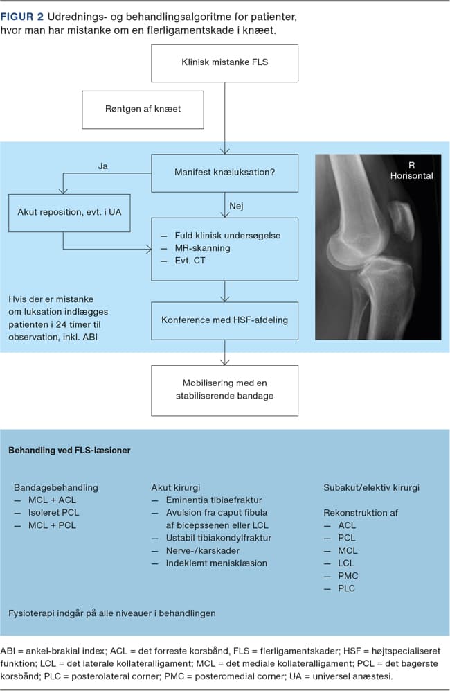 Flerligamentskade (FLS) i knæet medfører ofte en betydende reduktion i patientens aktivitetsniveau, varige men og i sjældne tilfælde tab af underbenet. FLS defineres som en ruptur af mindst to af knæets fire store ligamenter: det forreste korsbånd (ACL), det bagerste korsbånd (PCL), det mediale kollateralligament (MCL) og det laterale kollateralligament (LCL) [1]. Knæluksation er en særligt alvorlig FLS af begge korsbånd og mindst et kollateralt ligament. Ofte er der også skade af det popliteofibulære ligament, popliteussenen og det mediale posteriore oblique ligament. FLS udgør 0,02-0,2% af alle bevægeapparatskader [2]. Der foretages ca. 140 flerligamentoperationer om året i Danmark [3]. FLS opstår ved høj- eller lav-impact-traumer og hos hypermobile eller adipøse personer ved ultralav impact (»snubleskader«) [4].
